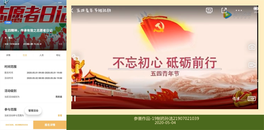 5月4日,太阳成集团122ccvip开展了志愿者日记活动。参与者通过短视频,微纪录片,或者vlog的形式记录志愿者抗疫服务的身影。同学们热心服务社区,用实际行动弘扬五四精神,绽放战疫青春。通过此次录制志愿者服务视频活动,让同学们能够在防控疫情期间,再次感悟志愿服务精神,回归志愿服务初心。