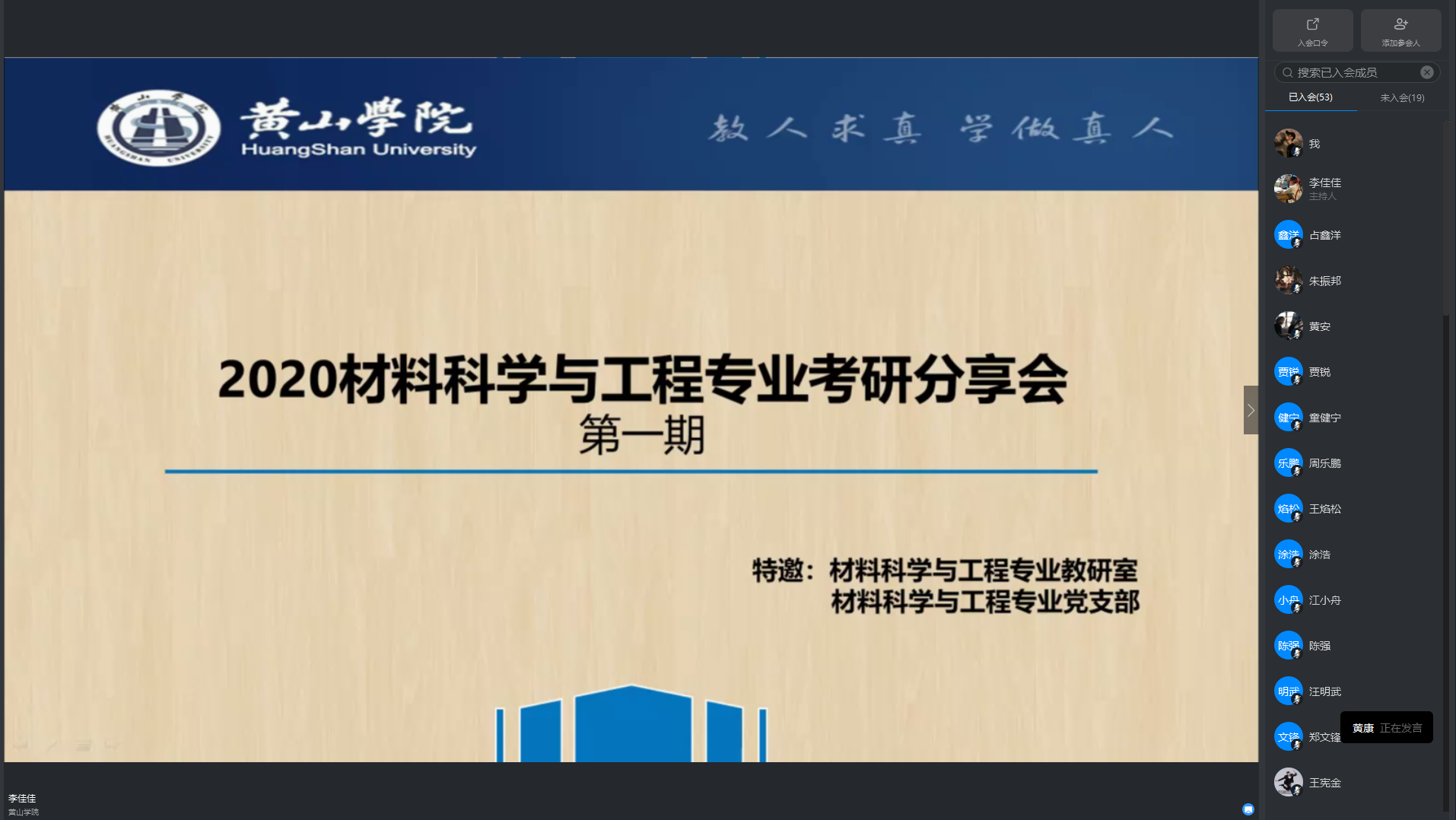 本次活动通过钉钉视频会议进行面对面经验交流,首先老师们从专业的角度分析了未来就业趋势,结合疫情带来的就业压力以及本专业的特点进一步阐述该专业考研的必要性。随后6名优秀考研员工代表分别从自身考研经历出发,从备考前到上岸后的历程通过故事的形式分享给学弟学妹;其中每位员工的分享反复说到一个词:“坚持”。会上,辅导员李佳佳对2020届材料科学与工程专业员工给予充分肯定,并特别感谢章鏴老师对16级、17级员工的倾情付出,最后强调在考研的路上一定要先确定好方向,有了方向速度才有意义。