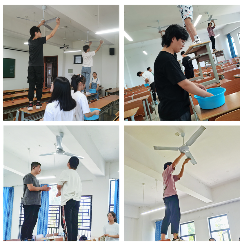 活动过程中,志愿者分工协作,相互配合,两人一组,一人负责擦扇,一人负责端水洗毛巾。志愿者们没有因为肮脏的灰尘污渍而退却,而是耐心、用心地去清洗每一台电风扇,一个多小时过去,教室里原本布满灰尘的电风扇焕然一新。