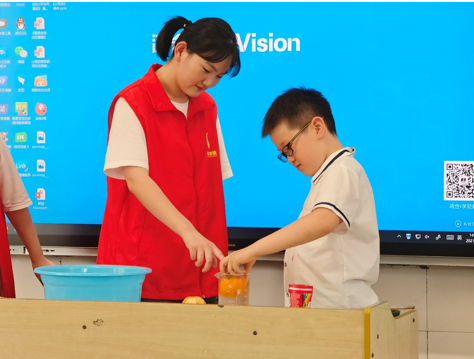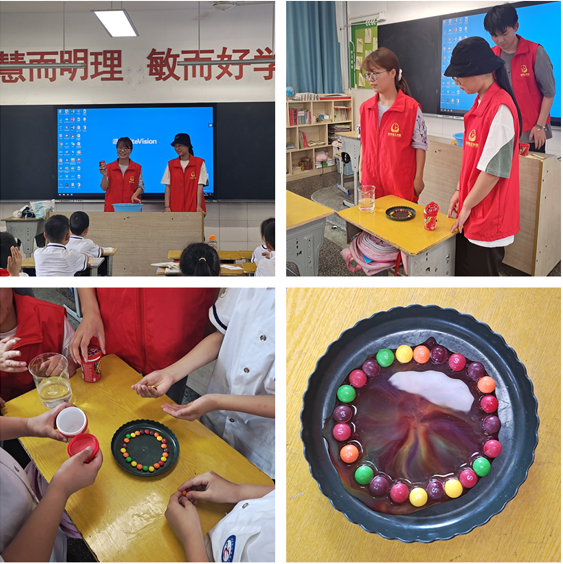 本期“科学实验进校园”为小朋友带来的两个实验是“彩虹摩天轮”和“穿救生衣的橘子”。第一个实验,志愿者向一个盘子中放入7颗彩虹糖,再倒入少许清水,静置两分钟后彩虹糖上的色素开始溶解于水,并向四处扩散,最终形成类似彩虹摩天轮的形状;第二个实验,利用橘子皮内海绵状组织疏松,密度小于水的密度的原理,使没剥皮的橘子上浮,剥了皮的橘子下沉。活动中,志愿者用风趣的教学方式引起员工的学习兴趣,使员工对志愿者所教内容充满好奇,员工都积极参与到课堂中回答问题,课堂氛围十分活跃。