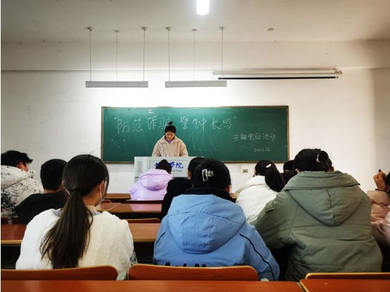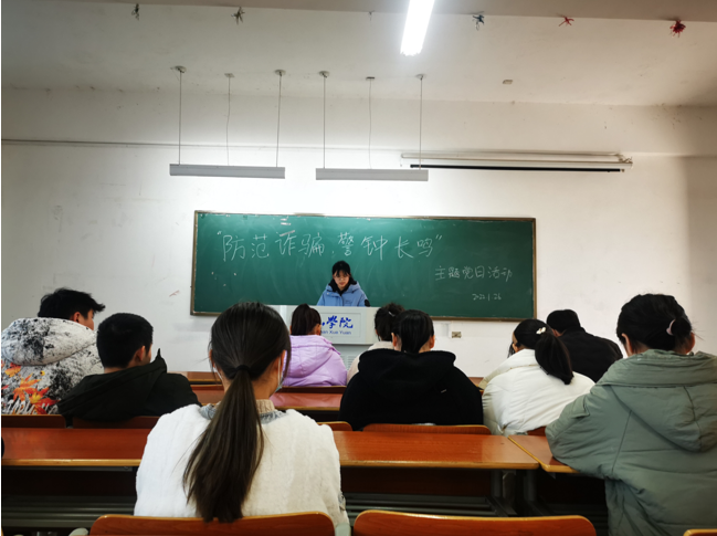 本次党日活动分别由党员代表和入党积极分子代表分享防诈小知识。首先,党员代表高金杰同学向大家详细介绍常见的六种诈骗类型:网络游戏虚假交易诈骗、刷单诈骗、冒充客服诈骗、冒充熟人诈骗、注销校园贷诈骗和杀猪盘诈骗。之后入党积极分子代表李郁跟大家分享了一些防诈小知识,帮助大家提高安全防范意识。
