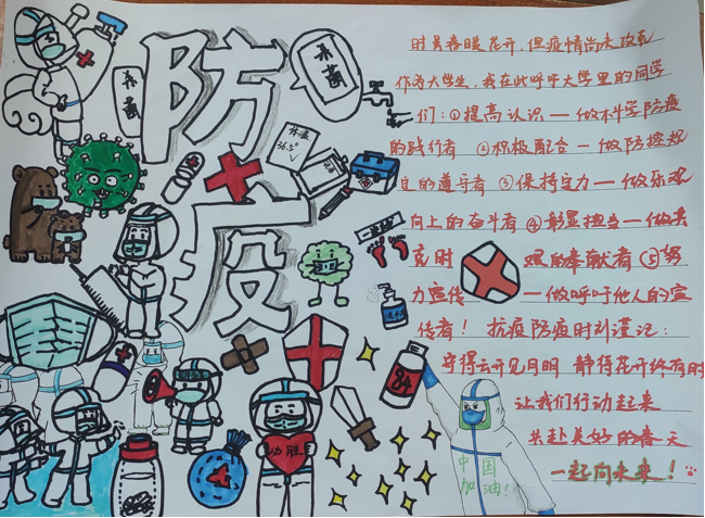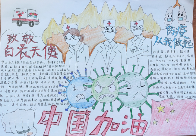 为进一步加强防疫宣传力度,增强广大同学的防护意识和责任意识,公司团委组织开展了“用心抗疫,携手凯旋”手抄报设计活动。参赛同学紧紧围绕疫情防控主题,采用多种途径查阅、收集防疫有关资料,精心选材并巧妙构思,一幅幅作品设计新颖,图文并茂,内容丰富,精彩纷呈。有的介绍了此次病毒的特点与传播途径,有的讲述了如何做好自我保护,一笔一画均表达了对医务工作者的敬意和对战胜疫情的信心。