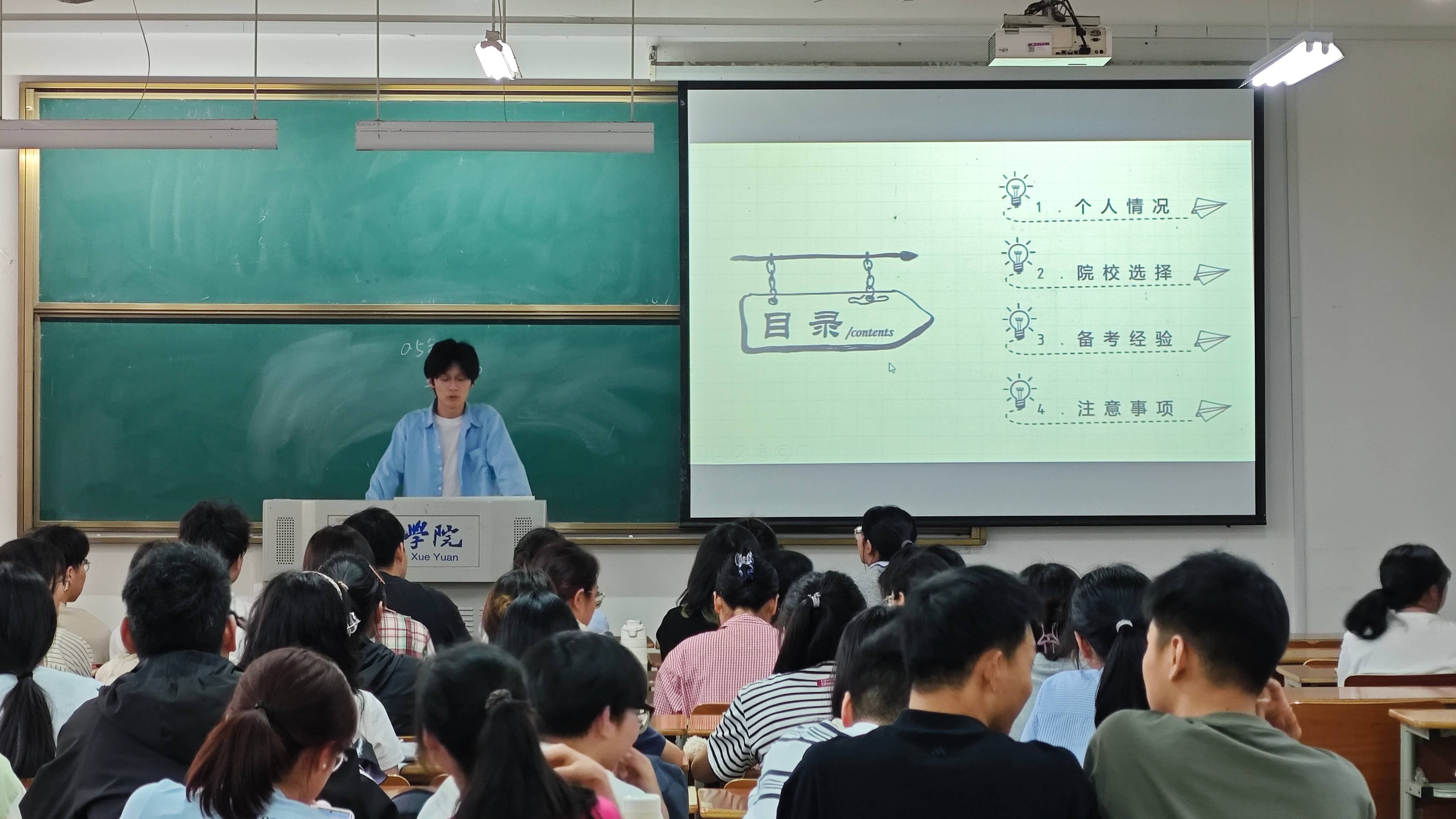 活动开始前,田子豪老师结合当前老员工考研和就业形势,针对考研公司和专业的选择,以及太阳成集团122ccvip今年考取硕士研究生情况,做出了全面的介绍和分析,鼓励同学们根据自身情况,明确考研的目的,理清考研和就业的关系。