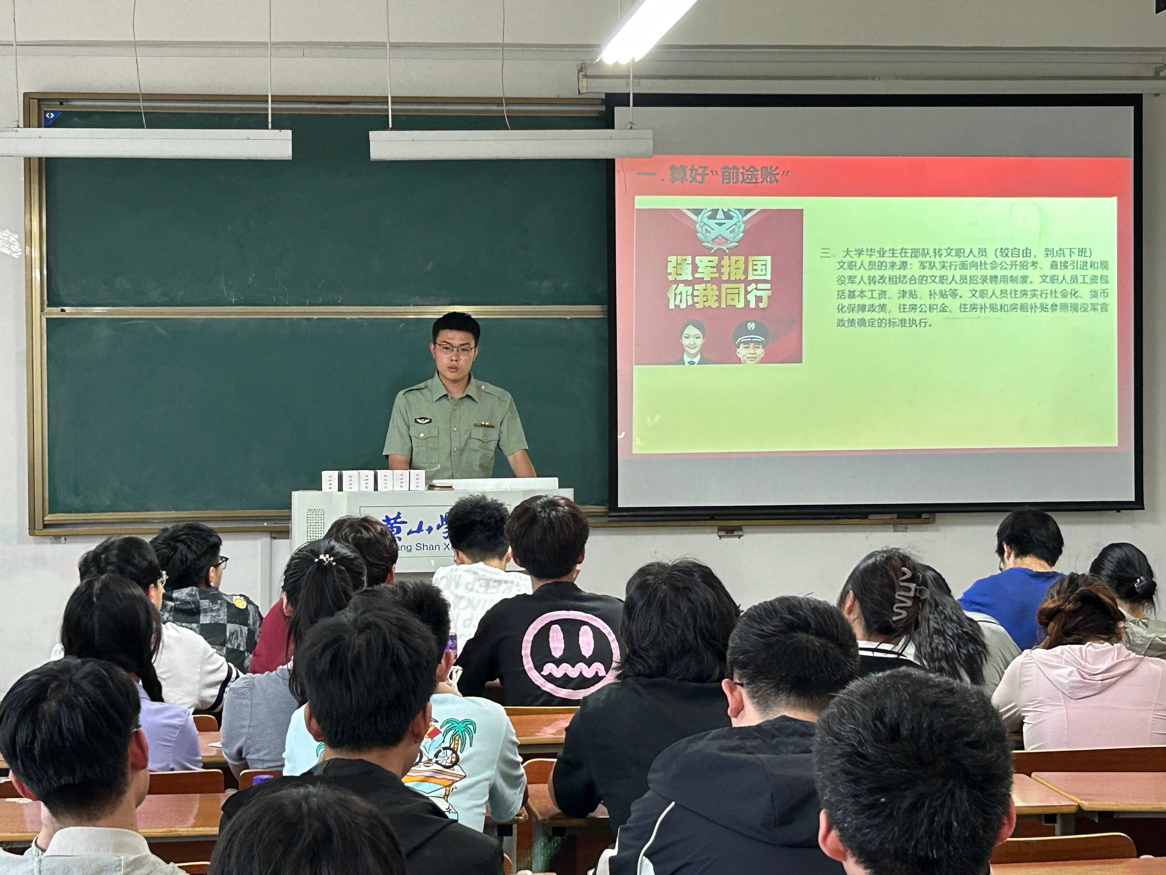 退役士兵郭帅就征兵政策、军队生活、个人成长等方面进行深入讲解和分享。郭帅同学说:“作为新时代的青年,我们应该树立正确的世界观、人生观和价值观,坚定理想信念,勇于担当责任。参军入伍不仅可以锻炼意志品质,提高综合素质,更可以让我们在为国家和人民服务的过程中实现自我价值,书写人生华章。因此,我呼吁广大青年朋友们积极响应国家号召,踊跃报名参军,为祖国的国防事业贡献自己的青春和力量。”他以自己的亲身经历和所见所闻,向大家展示军队的魅力和军人的风采,激励更多的青年投身国防事业,为祖国的繁荣富强贡献自己的力量。