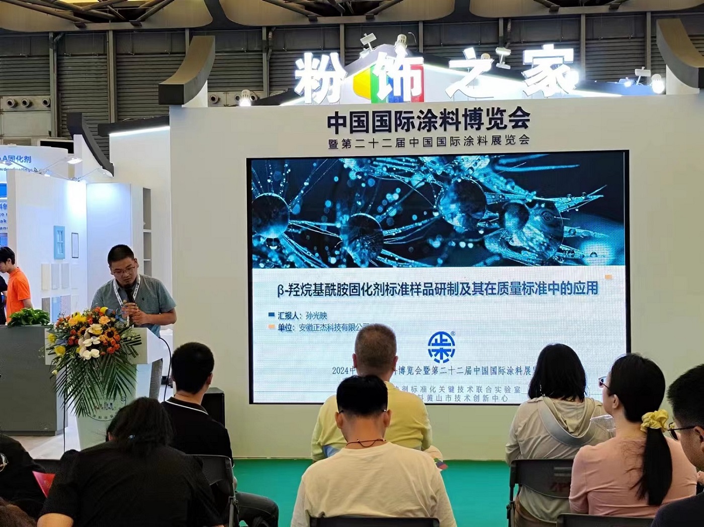 2024年8月7日,2024中国国际涂料博览会暨第二十二届中国国际涂料展览会在上海召开。公司绿色化工新材料黄山市技术创新中心的孙光映博士受邀作题为“β-羟烷基酰胺固化剂标准样品研制及其在质量标准中的应用”的学术交流报告。