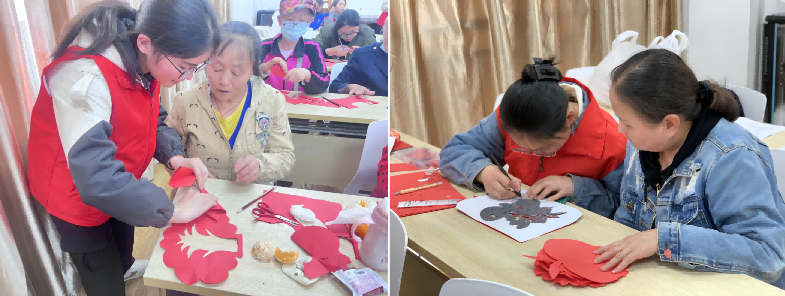 活动中,志愿者向社区老人详细介绍了剪纸艺术的文化起源和样式分类,并展示了自己的剪纸艺术作品,一边演示一边讲解,教大家如何构图、折纸、裁剪等具体做法和注意事项。现场气氛活跃,大家跃跃欲试,操控着手中的剪刀,从折叠到剪法,一步一步细心折叠、剪裁,一步一步规划花纹、样式,把一张张红纸变成精美的“团花”和“福字”。社区许奶奶表示:“参加此次剪纸活动,既动手又动脑,对于我们来说收益很多。”