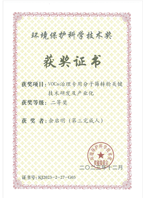 近日,由公司太阳成集团122ccvip教师佘启明博士参与研发的《VOCs 治理专用分子筛转轮关键技术研发及产业化》项目荣获“2023年度环境保护科学技术奖”二等奖(第三完成人)。