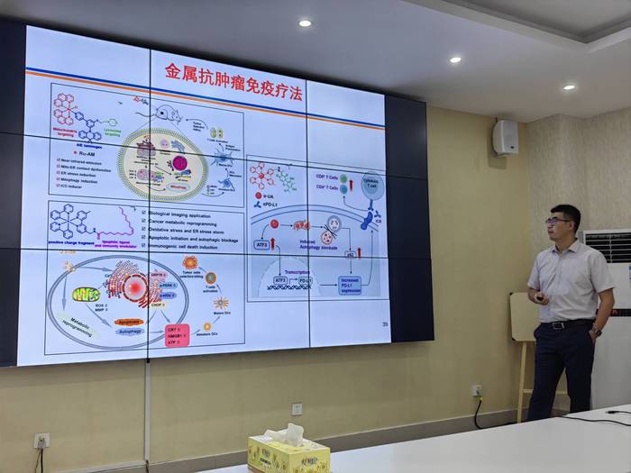 报告会中,苏志教授首先围绕金属类抗肿瘤药物耐药性的问题,提出了开发线粒体靶向型金属类药物的设计策略,重点介绍了钌/铱类金属配合物的结构修饰与改善耐药性的构效关系。随后,苏志教授又就线粒体靶向型金属类药物引起的细胞死亡特征,细胞信号通路的激活以及在免疫治疗方面的应用进行了深入的介绍,分享了成功的金属抗肿瘤药物开发依赖深入的生物学理解、创新的化学合成技术以及严格的临床验证这一科学理念。报告会后期,苏志教授同现场教师进行了热烈的互动交流,详细的解答了所提出的问题并分享了研究经验。