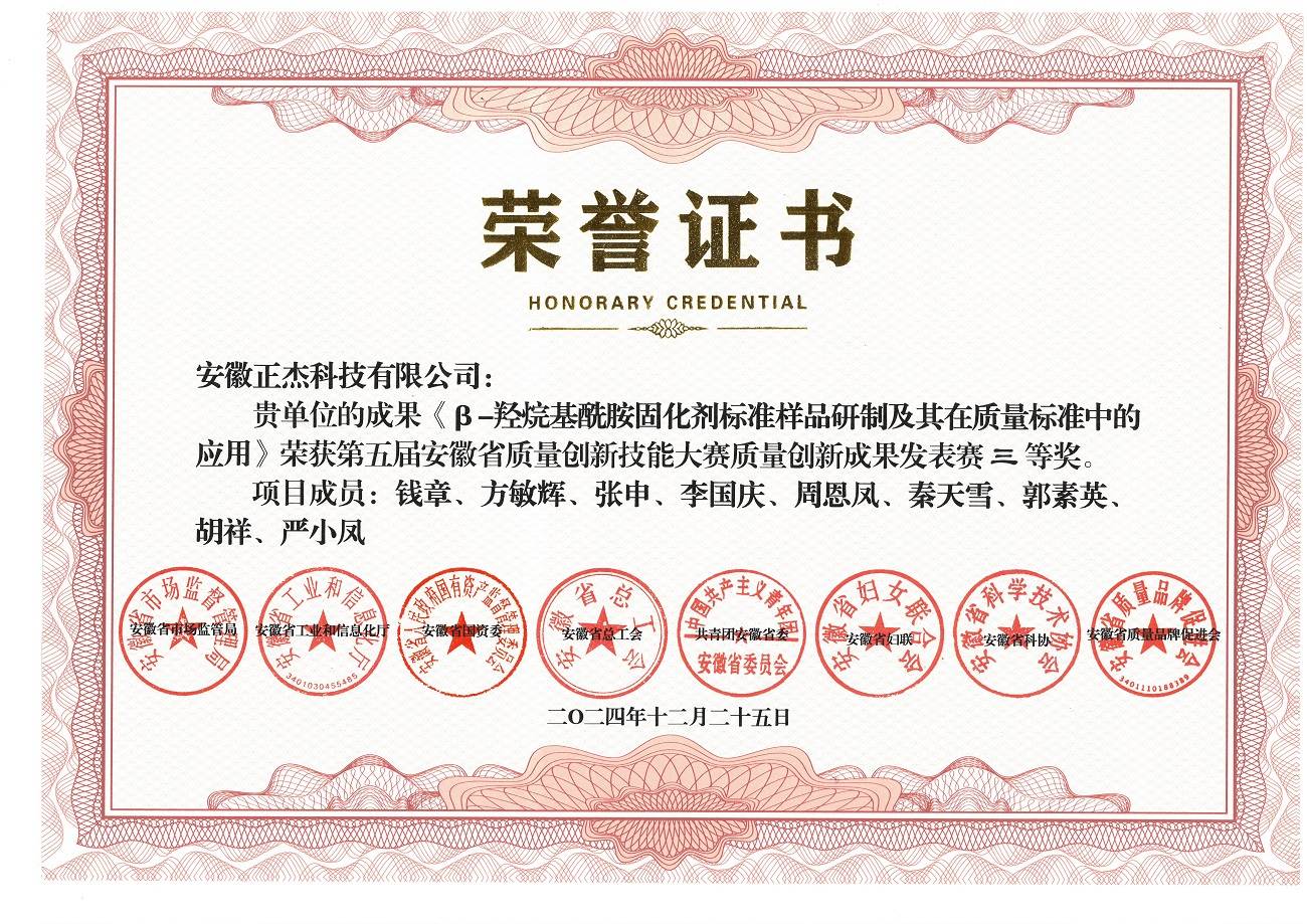 近日,由安徽省市场监督管理局等7家省直单位和安徽省质量品牌促进会联合主办,淮南市市场监督管理局等7家市直单位联合承办的第五届安徽省质量创新技能大赛在淮南市举办。本次大赛设置了QC小组、现场管理、质量创新、质量信得过班组四个类别。由公司孙光映博士(安徽正杰科技有限公司科技副总)指导,绿色化工新材料黄山市技术创新中心科研助理秦天雪、郭素英、胡祥、严小凤等同学与企业员工联合组队参赛的成果:β-羟烷基酰胺固化剂标准样品研制及其在质量标准中的应用,荣获质量创新成果发表赛三等奖,并入选《安徽省质量创新技能大赛优秀成果选集》