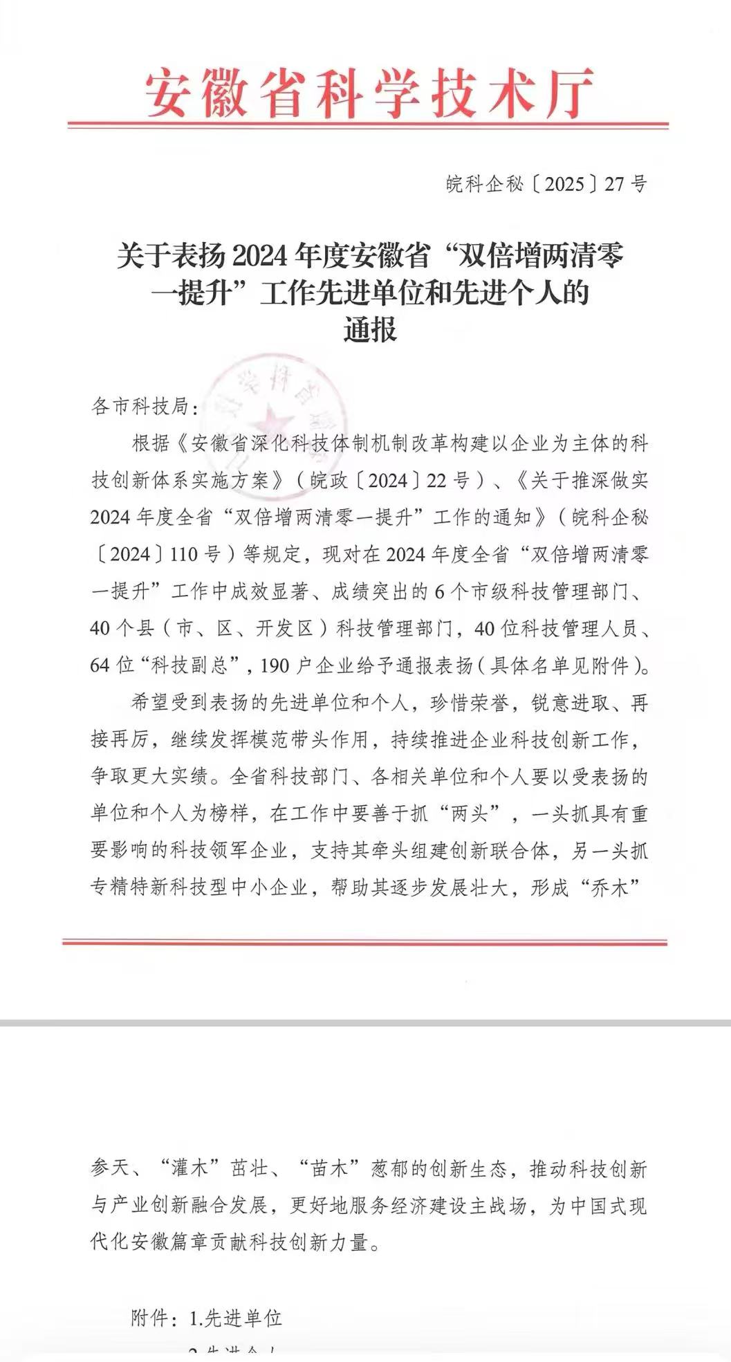 2025年1月27日,安徽省科学技术厅印发《关于表扬2024年度安徽省“双倍增两清零一提升”工作先进单位和先进个人的通报》(皖科企秘〔2025〕27号),太阳成集团122ccvip教师佘启明博士,荣获安徽省“双倍增两清零一提升”工作先进个人称号。